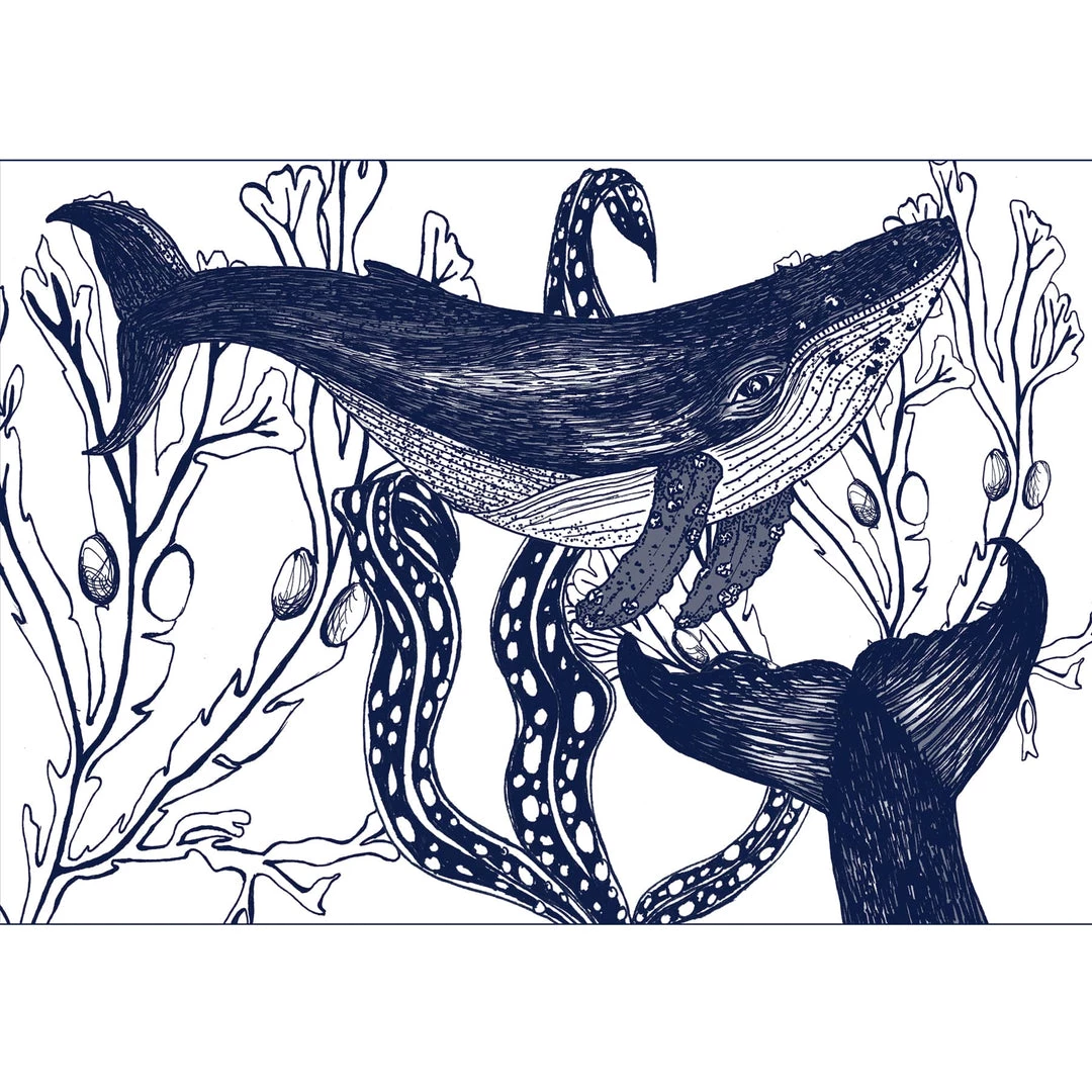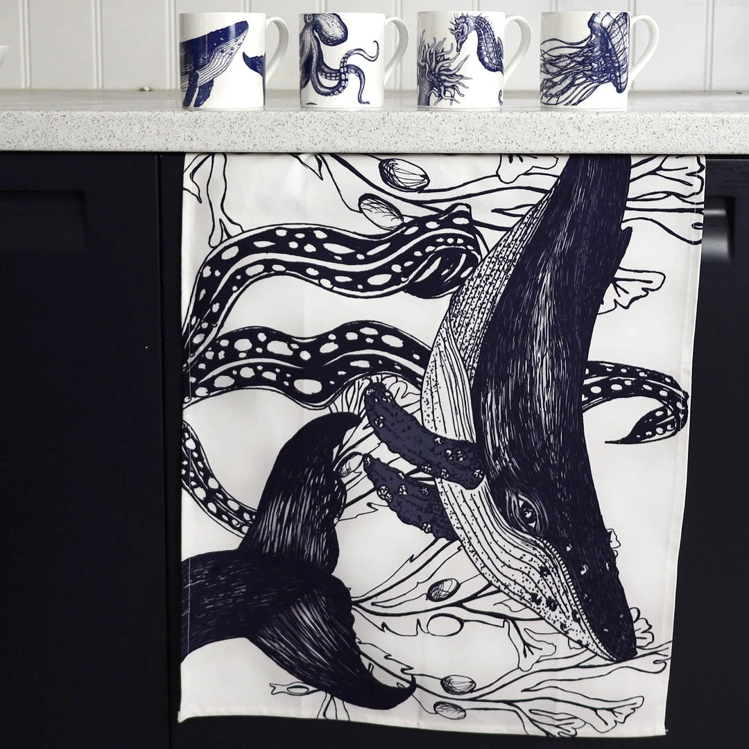 Our beautifully illustrated Whale tea towel features the Whale happily diving through the seaweed with his cheeky grin, we hope you love him as much as we do!
