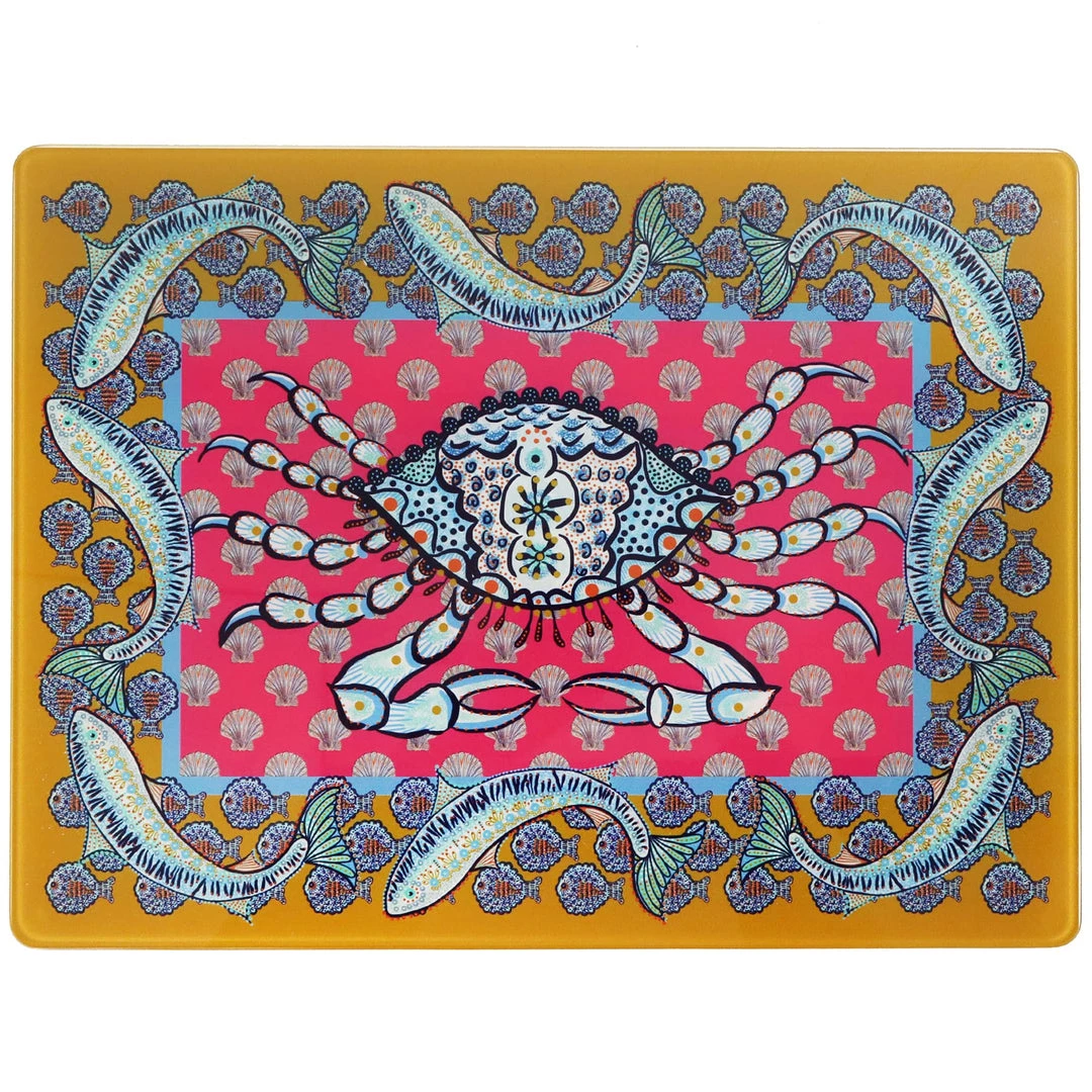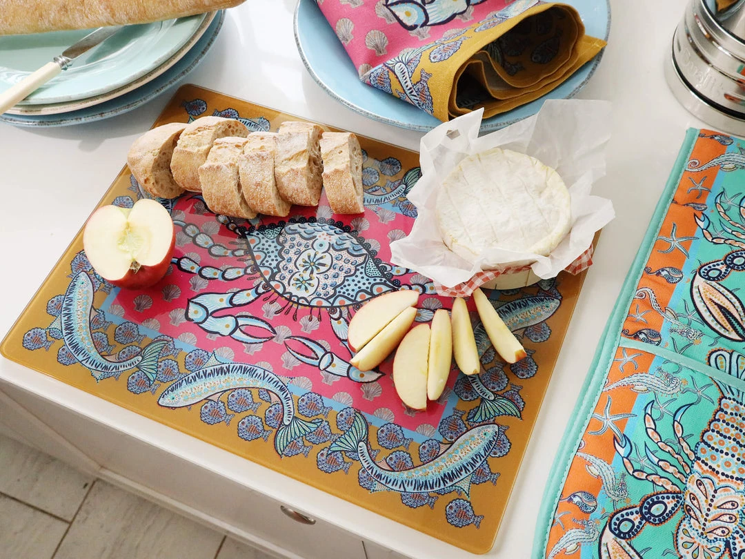 This eye catching worktop saver is simply gorgeous. The contrast of the bright pink, blues and sun washed yellow background makes the intricately illustrated crab and sea creature design absolutely pop.