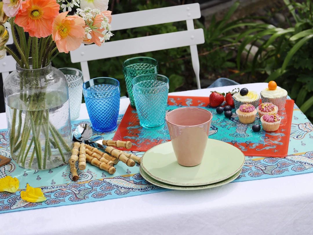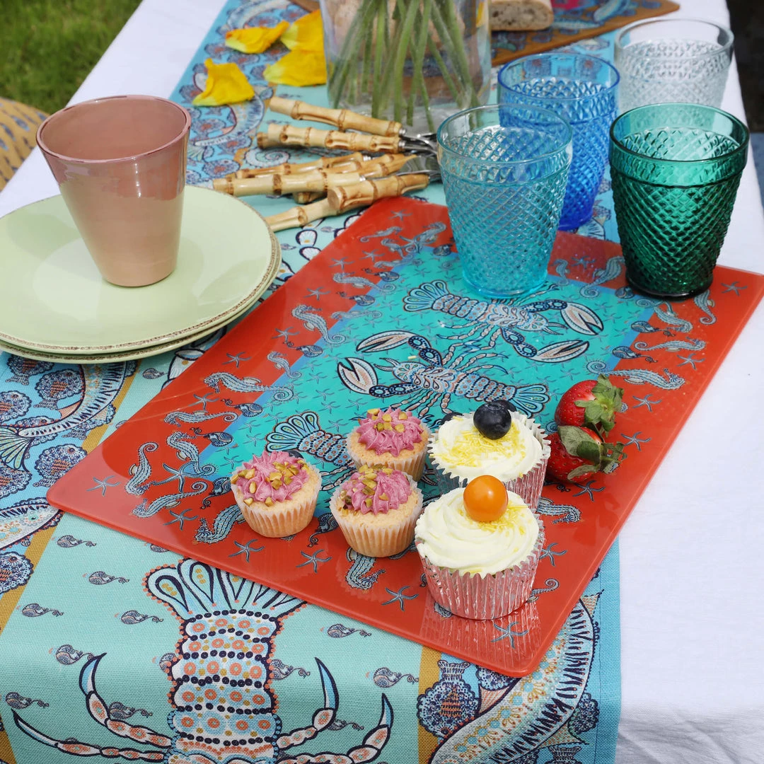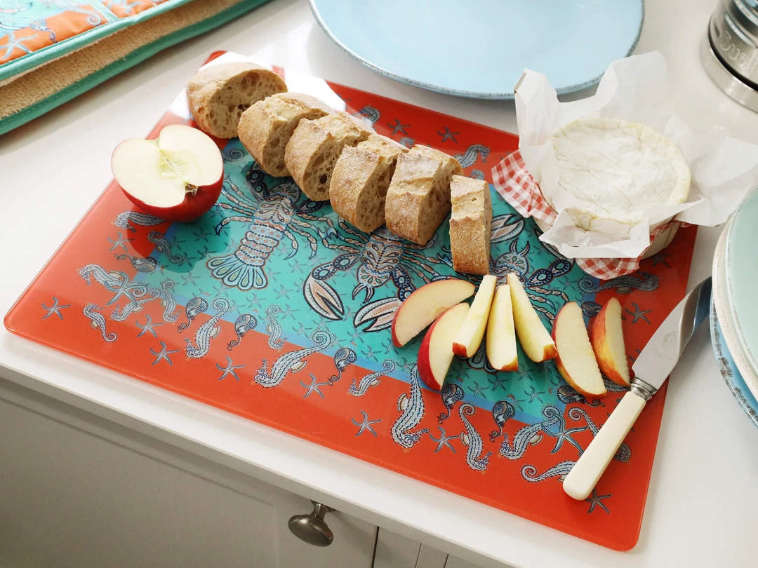 Made from toughened recycled glass, this beautiful, yet practical worktop saver protects your kitchen. The intricately illustrated lobsters take pride of place in the centre of this design and are surrounded by an ethereal collection of seahorses, starfish and shells. The combination of the cerulean and pale blue background along with the sun washed yellow border instantly adds playful and bright summer feels to your kitchen space.