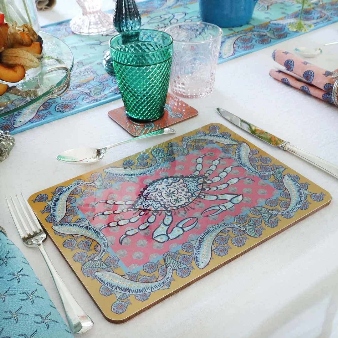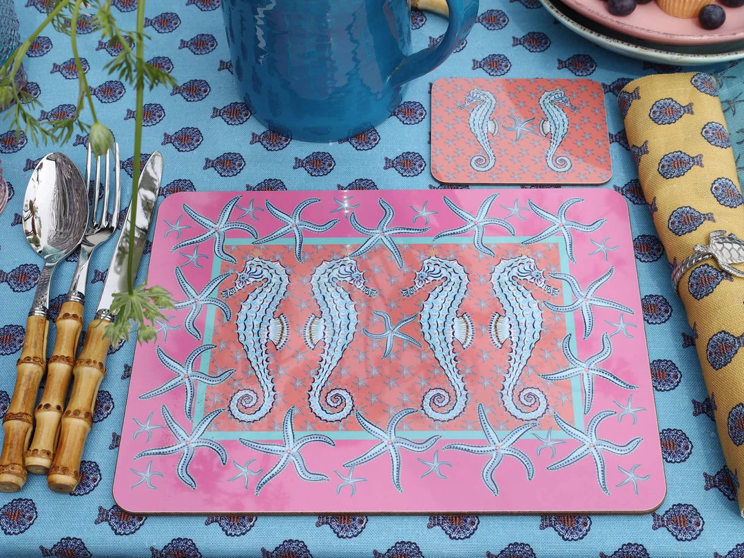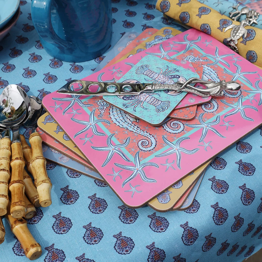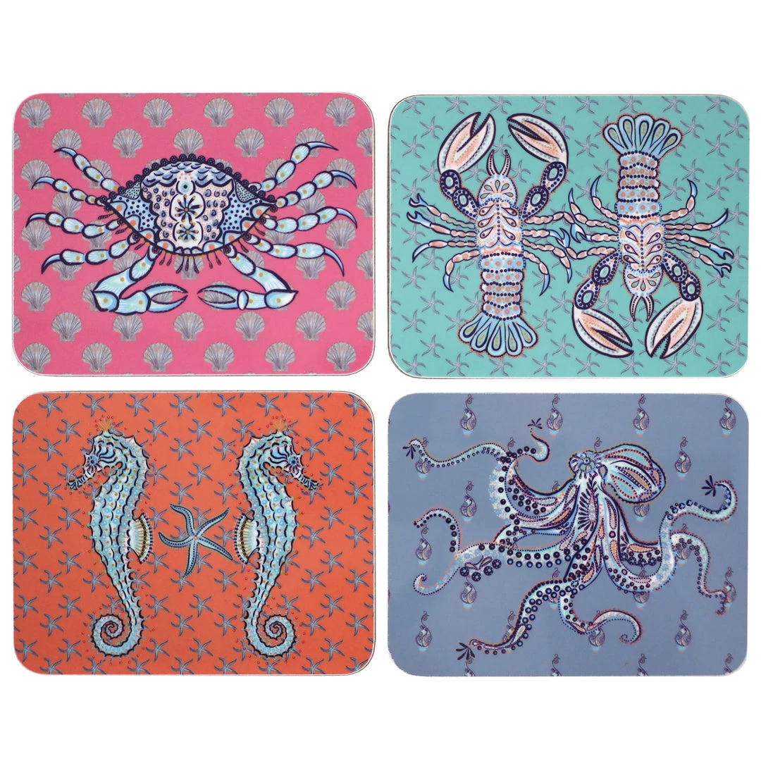 Instantly add playful and bright summer feels to your table with these gorgeous coasters for your mugs and glasses. Each coaster features an intricately illustrated sea creature on a background of floating shells, starfish and fish. The striking colours and designs make these coasters unique and the talking point of any table.