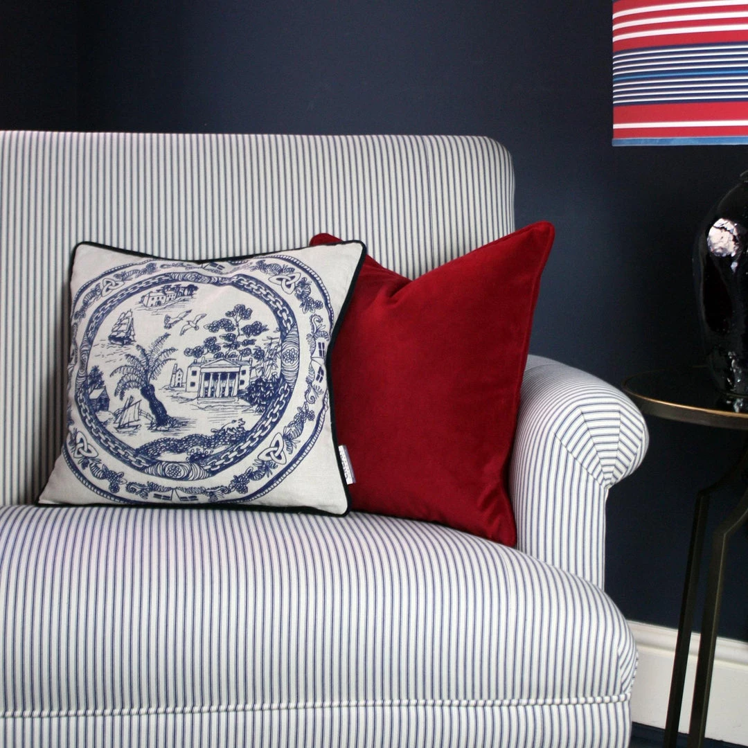 Made locally in Falmouth, the quality of our cushions are second to none and we love that they are locally made. These luxury cushions are finished with a zip, have a navy velvet back and are edged in matching piping.