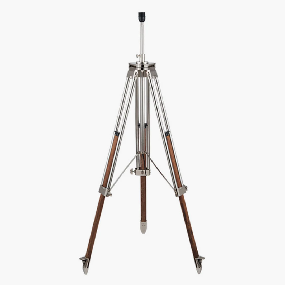 This oversized wooden handcrafted tripod lamp base has a modern twist to it with the addition of chrome metal detail on the legs. With the oak finish legs and the oversized feel to this lamp, nautical glamour has never been so contemporary.