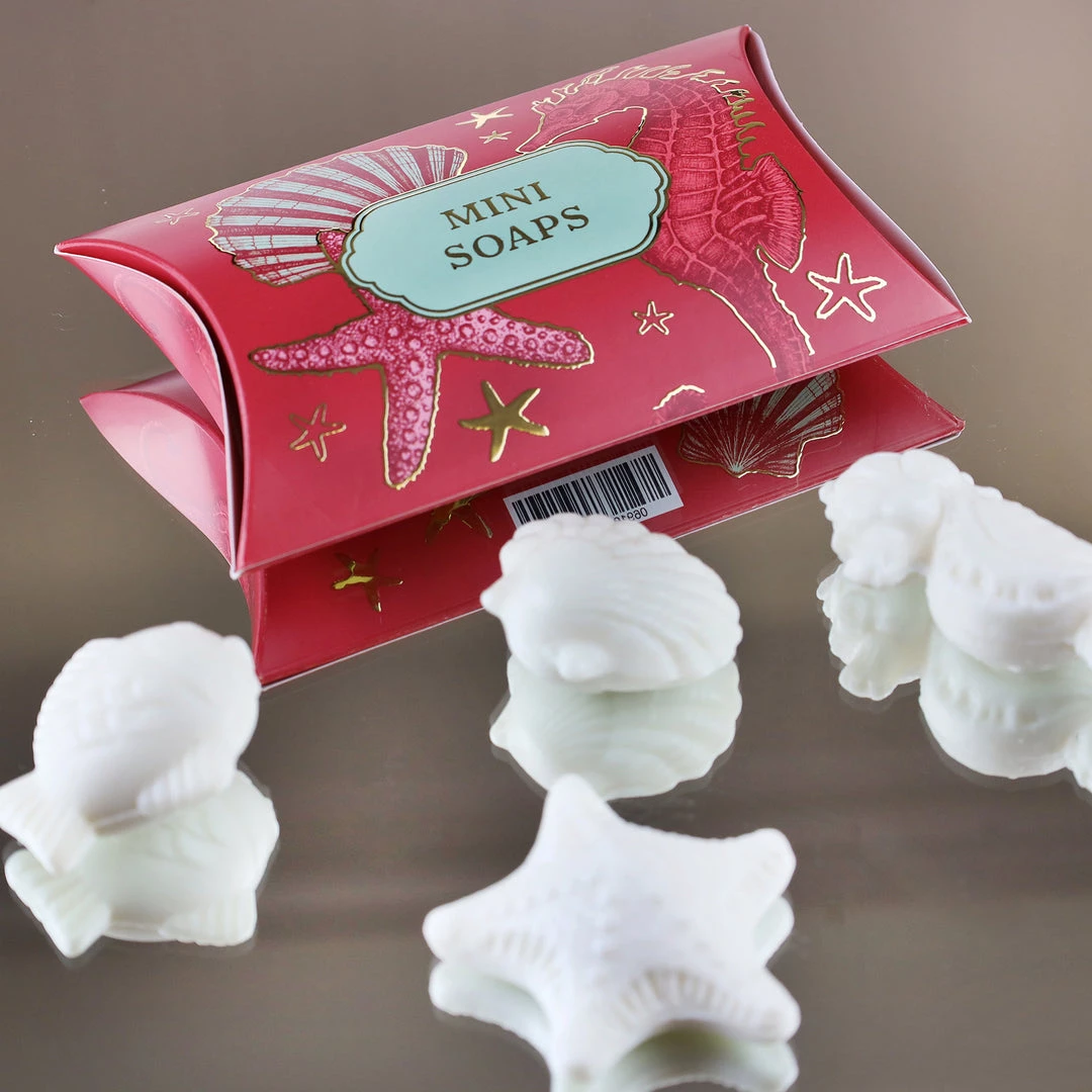 There are 4 fragranced mini coastal soaps in a beautiful pillow shaped gift box, decorated in our lovely sea creature illustrations and highlighted with a raised gold accent. Best of all there’s no need to wrap as they are ready to give!